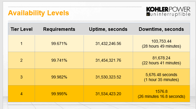 The Uptime Institute’s four-tier classification system allows users to balance resilience levels against cost. Fig.1 shows the uptime requirements for the four levels. However, the uptimes are achieved through various redundancy levels, which have differing impacts on UPS utilisation and efficiency.