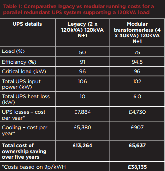 The overall energy savings, over several years, from migrating to a modular UPS system from a poorly utilised legacy installation can be quite considerable, as the table below shows.