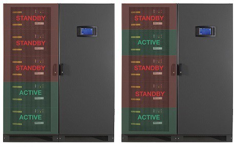 The active modules all operate in double conversion mode, and share the load equally. The passive modules are in standby mode, with their inverters switched off, ready to transfer to active double conversion operation when the load increases.