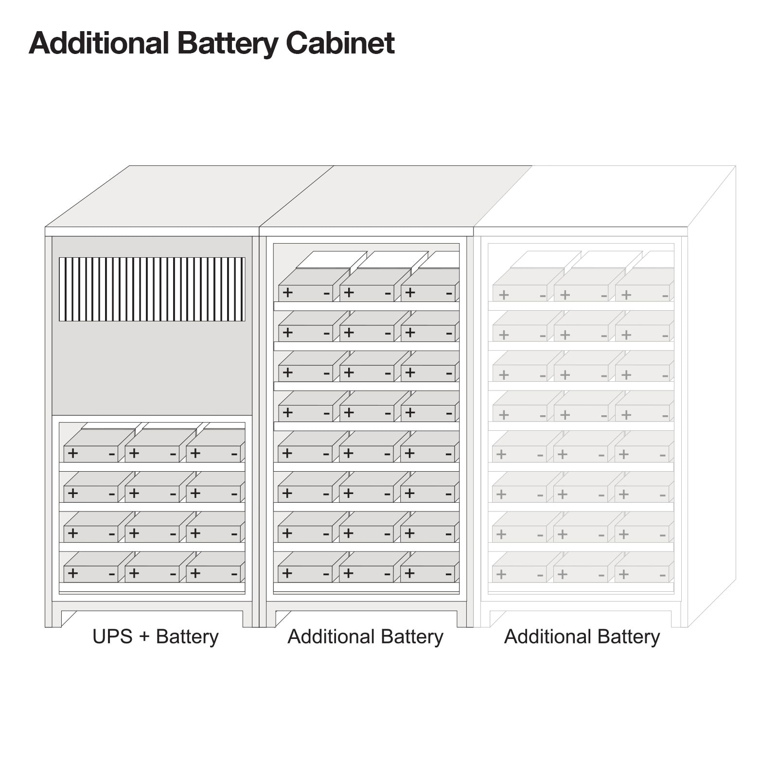 VRLA batteries can be housed in cabinets alongside the UPSs rather than in separate battery rooms, even if the UPSs are operating within an office environment. However, because the combined voltage of the battery system will be the same as a mains electricity supply, for safety reasons it should be protected from unauthorised or accidental contact.