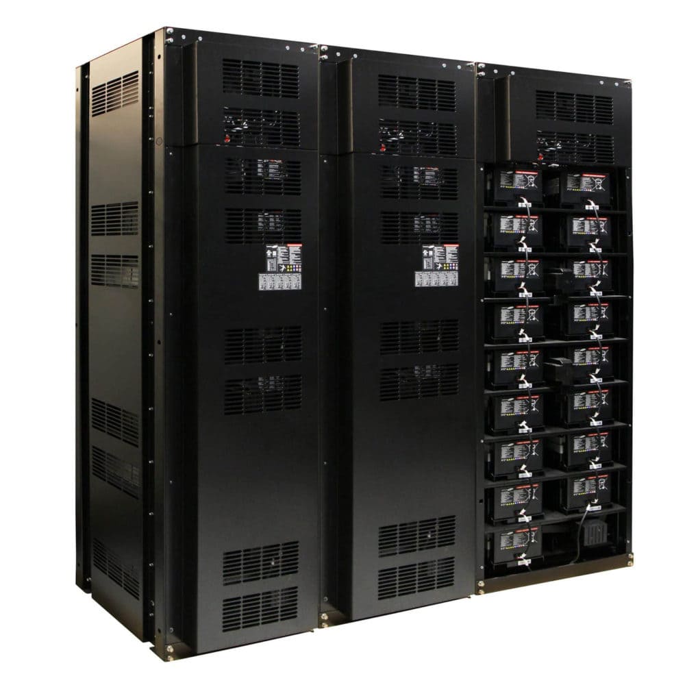 A single cabinet configuration of 34.6 kWh comprises one switchgear, one switched mode power supply (SMPS) and 17 battery modules.