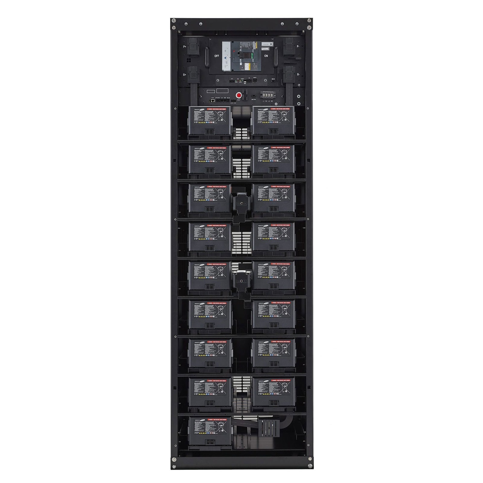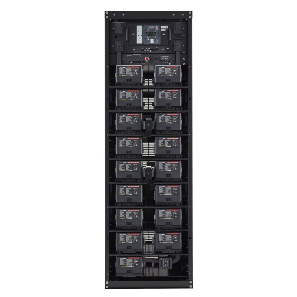A single cabinet configuration of 34.6 kWh comprises one switchgear, one switched mode power supply (SMPS) and 17 battery modules.