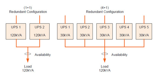 An example will show how these factors can translate into availability levels for the UPS. Fig.1 shows a 120kVA load, supported alternatively by a 1+1 system, or a 4+1 system.