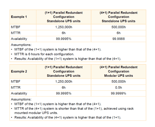 Table 1 shows how UPS availability is affected by the choice of configuration. It also makes some other key points; the highest availability comes from using a 4+1 rack-mounted modular solution. And this is entirely due to the modular system’s hot swap capability, which allows MTTR to be reduced from six hours to half an hour. Merely going from 1+1 to 4+1 configurations using standalone systems actually reduces MTBF, and availability, because of the increase in components associated with the change.