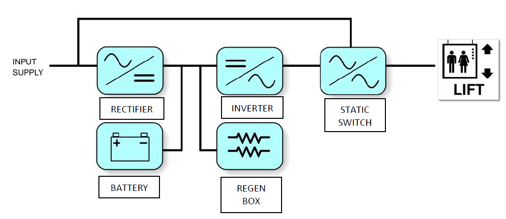 Any UPS chosen to support emergency lifts must include protection from the regenerated power fed back from lifts during their normal operation. Otherwise, this reverse energy would cause the UPS’s internal DC bus voltage to rise above its safe design levels, possibly damaging the DC capacitors, rectifier and inverter.