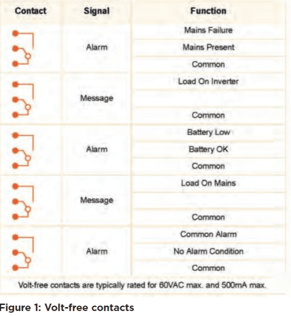 However, there is no point in investing in a communications capability beyond the realistic needs of an application; accordingly, this article looks at the various options available. At the simplest level, ‘true/not true’ information can be obtained from volt-free contacts that can communication UPS status and alarms to other equipment on the same site as the UPS. Windows, Mac, Linux, Unix and other PC or network operating system variants support software that can detect these alarms and react by initiating an orderly system shutdown automatically. Figure 1 shows some typical volt-free UPS status signals.